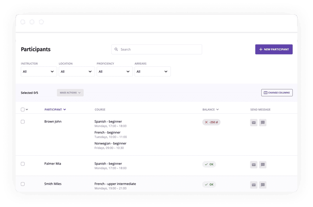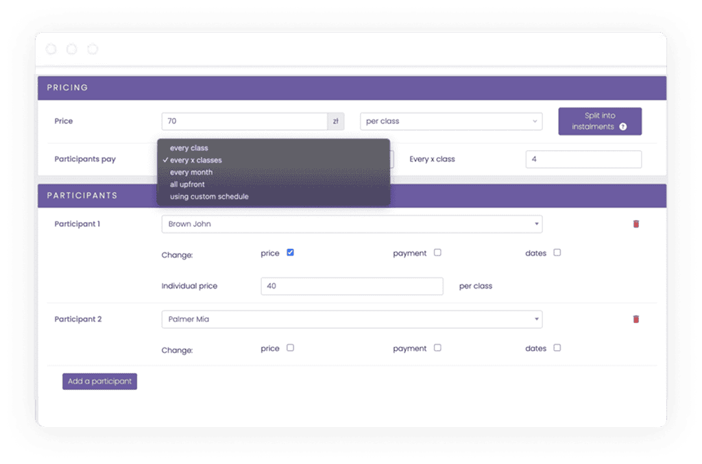 - Automatic price calculation based on the number of lessons per week