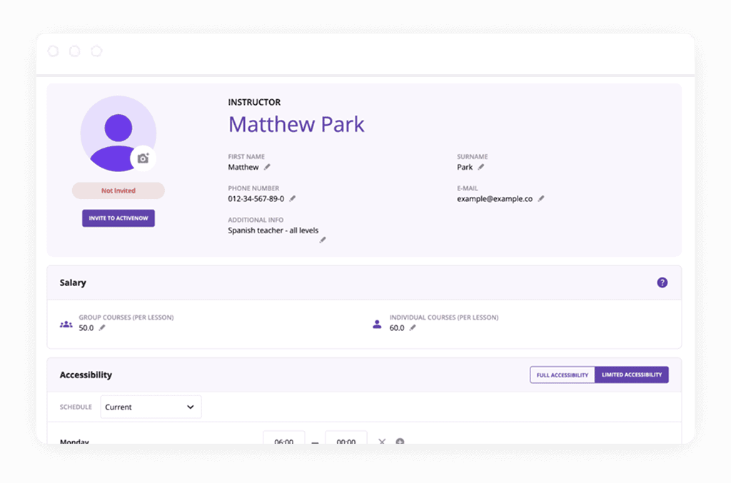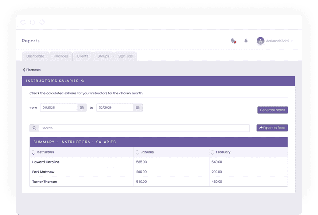 - Automatic calculation of instructors salaries based on the hours worked and custom rates