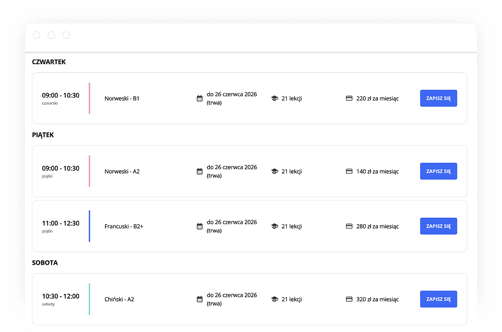 (z możliwością zapisu na lekcje, na których są wolne miejsca)