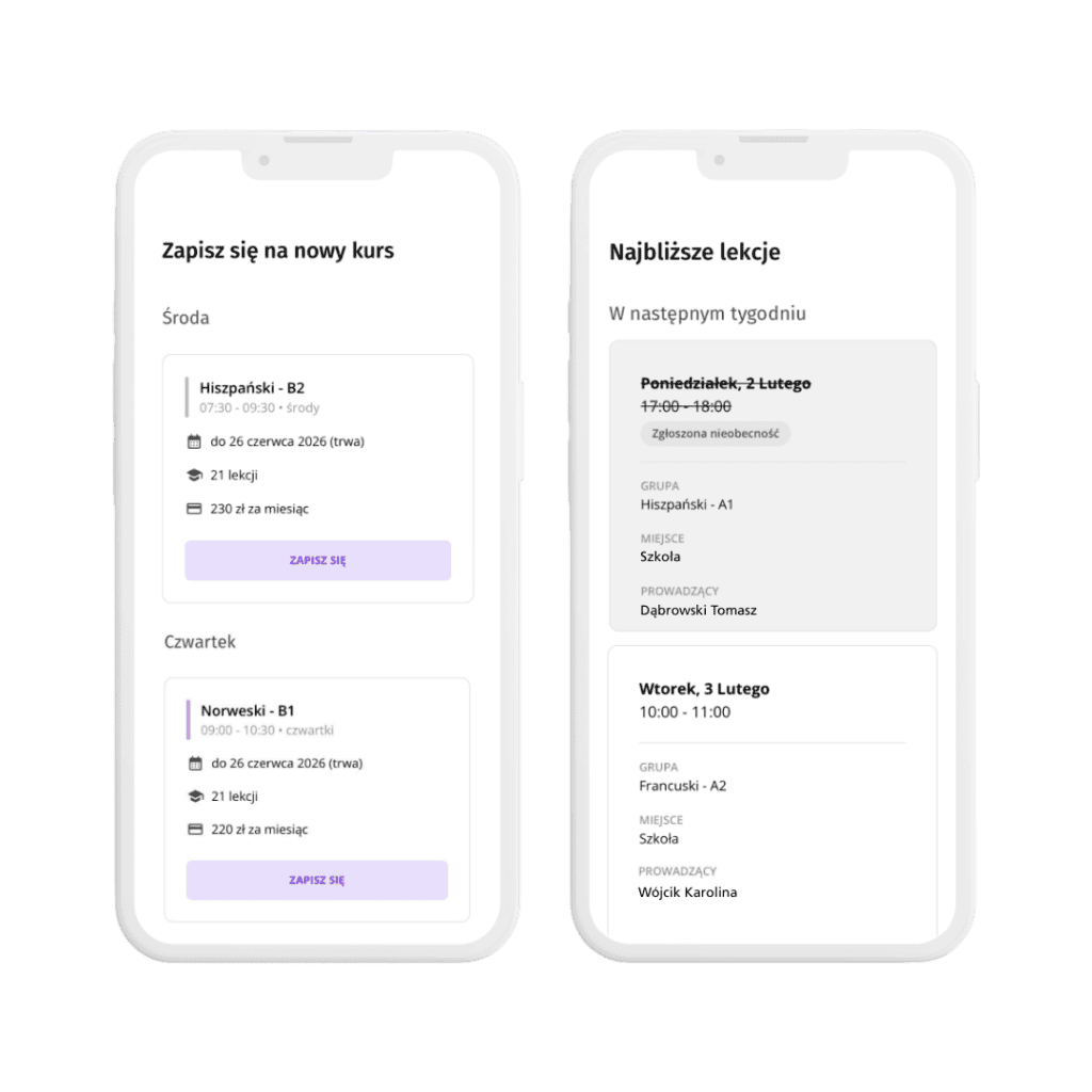 - Zapis na lekcje z poziomu aplikacji