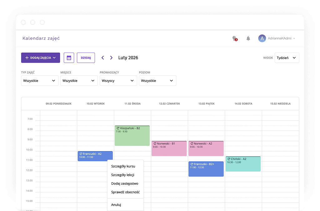 - Interaktywny kalendarz obsługujący wszystkie rodzaje lekcji (cykliczne, jednorazowe, indywidualne, grupowe) i wydarzeń (np. dni otwarte)