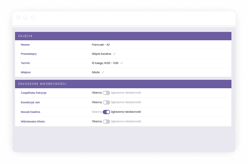 - Możliwość sprawdzania obecności na zajęciach