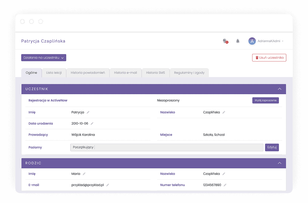 - Dodawanie własnych pól w profilu uczestnika (np. uwagi, postępy