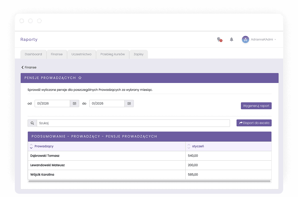 - Automatyczne wyliczanie pensji prowadzących na podstawie liczby przepracowanych godzin i podanej stawki