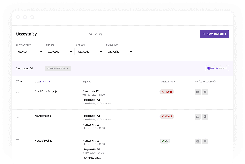 - E-maile/SMS-y do wszystkich lub konkretnych prowadzących